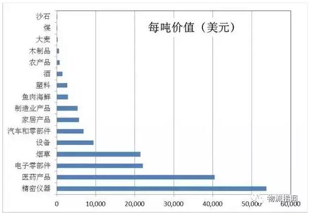 其次是經濟水平決定的貨物價值。同樣一公斤貨,因爲單(dān)公斤貨物價值的不同會對GDP産(chǎn)生很大影響。例如下圖是美國不同類别的貨物平均每噸的價值,可以看到差别非常大,一噸煤和一噸煙草價值可以相差100倍。同樣一噸貨物,價值更高對應的GDP就更高。